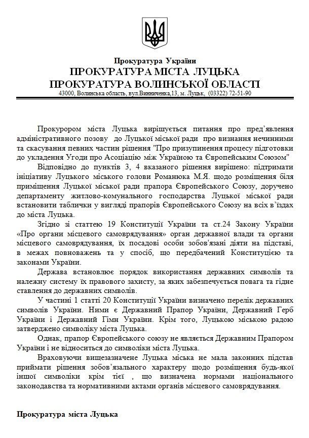 Наводимо повний текст офіційного коментаря прокуратури міста Луцька: Прокурором міста Луцька вирішується питання про пред’явлення адміністративного позову до Луцької міської ради про визнання нечинними та скасування певних частин рішення «Про призупинення процесу підготовки до укладення Угоди про Асоціацію між Україною та Європейським Союзом» Відповідно до пунктів 3, 4 вказаного рішення вирішено: підтримати ініціативу Луцького міського голови Романюка М.Я. щодо розміщення біля приміщення Луцької міської ради прапора Європейського Союзу, доручено департаменту житлово-комунального господарства Луцької міської ради встановити таблички у вигляді прапорів Європейського Союзу на всіх в’їздах до міста Луцька. Згідно зі статтею 19 Конституції України та ст.24 Закону України «Про органи місцевого самоврядування» орган державної влади та органи місцевого самоврядування, їх посадові особи зобов'язані діяти на підставі, в межах повноважень та у спосіб, що передбачений Конституцією та законами України. Держава встановлює порядок використання державних символів та належну систему їх правового захисту, за яких забезпечується повага та гідне ставлення до державних символів. У частині 1 статті 20 Конституції України визначено перелік державних символів України. Ними є Державний Прапор України, Державний Герб України і Державний Гімн України. Крім того, Луцькою міською радою затверджено символіку міста Луцька. Однак, прапор Європейського союзу не є Державним Прапором України і не відноситься до символіки міста Луцька. Враховуючи вищезазначене Луцька міська рада не мала законних підстав приймати рішення зобов’язального характеру щодо розміщення будь-якої іншої символіки крім тієї, що визначена нормами національного законодавства та нормативними актами органів місцевого самоврядування.