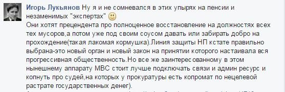 "Ну я і не сумнівався в цих упирів на пенсії і незамінних "експертів" (мається на увазі профспілка - авт.), -пише в ФБ Ігор Лук'янов. - Вони хочуть прецеденту про повноцінне відновлення на посадах всіх тих мусорів, а потім вже під своїм соусом давати або забирати добро на проходження (така ласа годівниця) Лінія Захисту НП (Нацполіціі - авт.)., до речі, правильно обрана - це новий орган і новий закон, на ухваленні якого наполягала вся прогресивна громадськість".