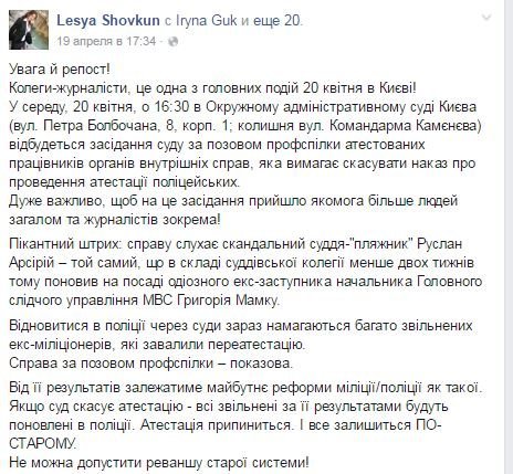 Волонтери та активісти вже б'ють на сполох. "Справа за позовом профспілки — показова. Від її результатів залежатиме майбутнє реформи міліції/поліції як такої. Якщо суд скасує атестацію — всі звільнені за її результатами будуть поновлені в поліції. Атестація припиниться. І все залишиться ПО-СТАРОМУ", — написала на своїй сторінці ву ФБ волонтер Леся Шовкун напередодні судового засідання.