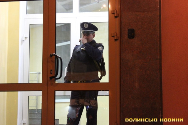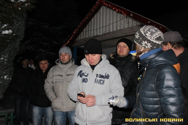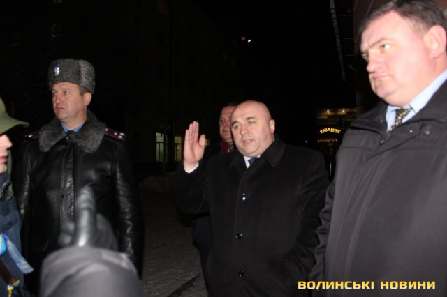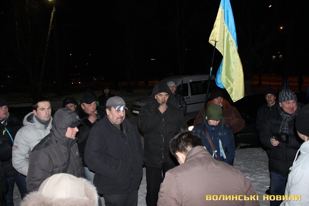 Спочатку силовики закрили двері приміщення, не пускаючи всередину нікого.Згодом до людей, у супроводі колег-міліціонерів, вийшли заступники начальника УМВС у Волинській області генерал-майора Терещука: Олександр Никитюк та Володимир Поліщук.На запитання громадян про те, з якої причини у активіста автомайдану відібрали права, Олександр Євгенович прямо відповів – за створення аварійної ситуації, коли напередодні водій Subaru підрізав автобус з бійцями Внутрішніх військ, які прямували на Київ. Хоча, зі слів учасника акції, який довго сперечався з полковником Никитюком, водій автобуса написав заяву про те, що автівка перешкоджала руху саме під тиском безпосереднього керівництва.