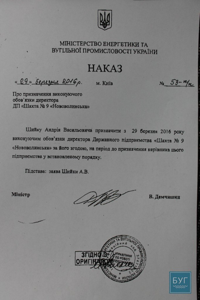 Виконувачем обов’язків директора ДП «Шахта №9 «Нововолинська» призначили Андрія Шийку. Призначення відбулося згідно з наказом Міненергетики України від 29-го березня 2016-го року.