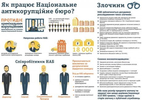 Як очікується, нове бюро займатиметься розслідуванням корупційних злочинів, вчинених високопосадовцями: міністрами, депутатів, держслужбовцями 1-2 категорії, суддями, працівниками Генпрокуратури, військовими вищого офіцерського складу, керівниками держпідприємств.