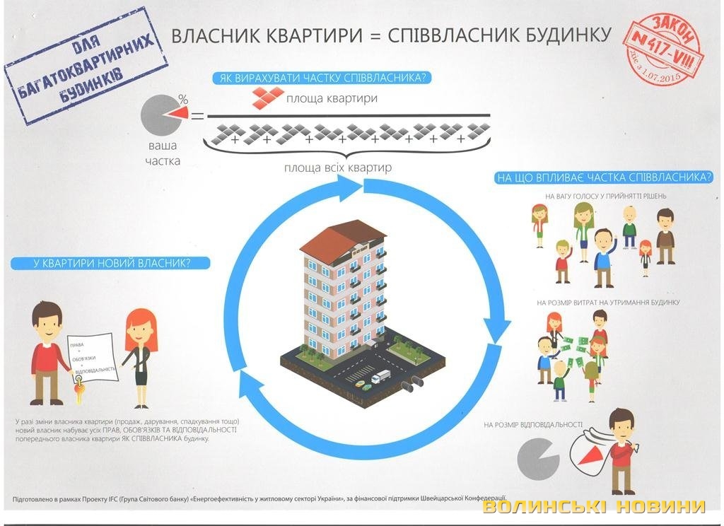Насправді, ними українці стали ще тоді, коли приватизували свої квартири, хоч і держава свого часу упустила цей момент. Адже в свідоцтві йдеться про право власності на квартиру, але немає жодного слова про частку в спільному майні. Та одночасно з житловою площею квартир вони стали співвласниками спільного майна: дахів, підвалів, стін, комунікацій.