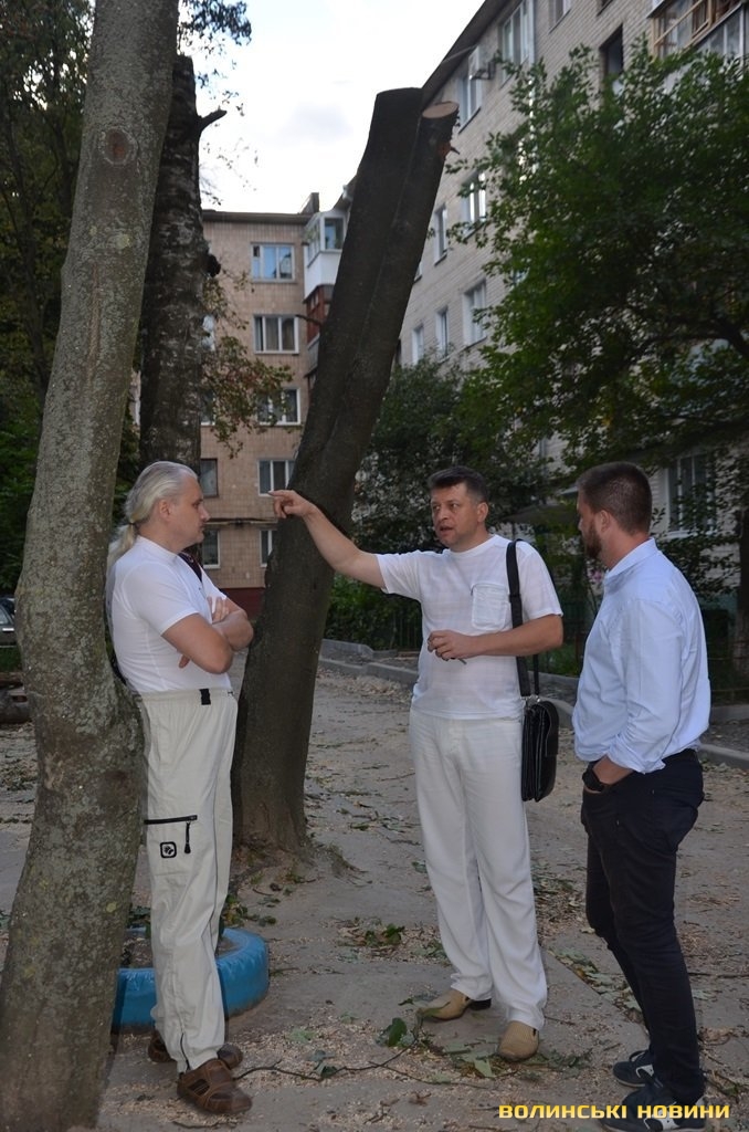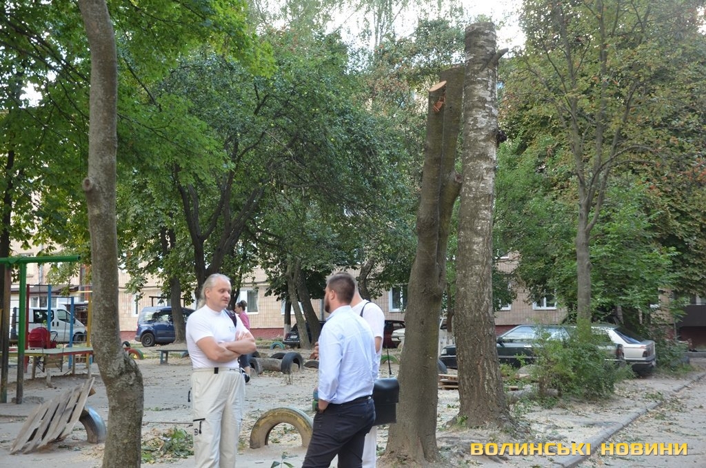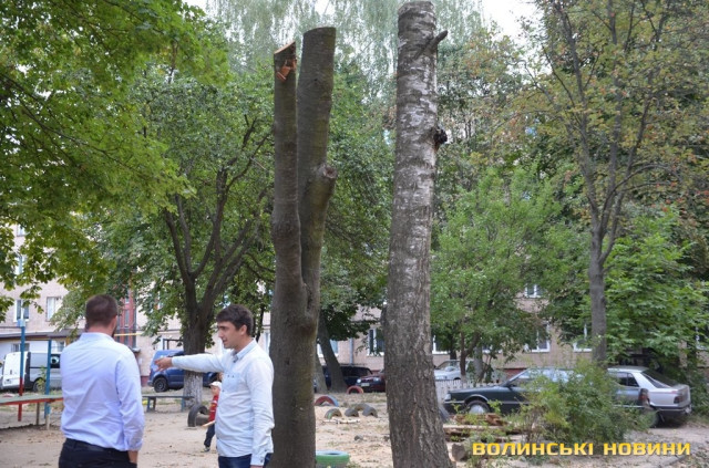 Так, 30 серпня у дворі будинків, що по проспекту Відродження, 12 та 14 і вулиці Гетьмана Сагайдачного, 29, працівники КП «Парки і сквери міста Луцька» взялися зрізати 5 дерев. А робилося це для того, щоб розширити дорогу двору для автомобілістів, адже наразі тут здійснюється капітальний ремонт вулиці.Факт зрізання зелених насаджень занепокоїв перехожих і вони викликали луцьких муніципалів. Ті, прибувши на місце, затребували у робітників комунального підприємства відповідні дозволи на здійснення робіт. Але, на жаль, таких документів комунальники надати не змогли. Натомість розповіли, що вказівку на знесення зелених насаджень отримали від директора підприємства. Після цього робітники швидко повантажили деревину на спецтехніку і поїхали з місця події.