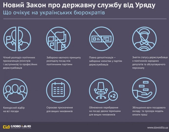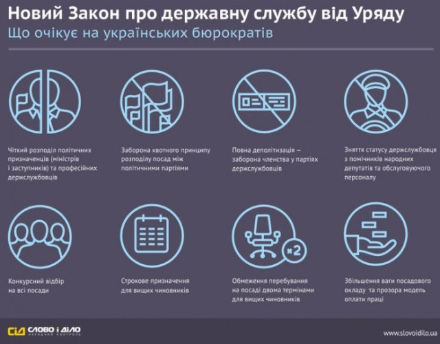 Зауважимо, що Закон України «Про державну службу» парламентарі ухвалили 10-го грудня 2015-го року. Згідно з офіційною інформацією із сайту Верховної Ради, - документ направили на підпис Президенту ще 18.12.2015-го року. Тому наступний крок за Гарантом.