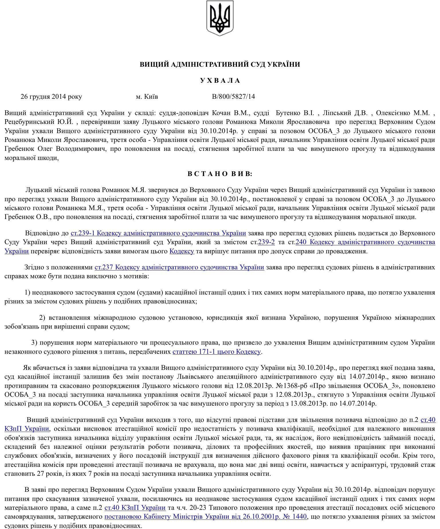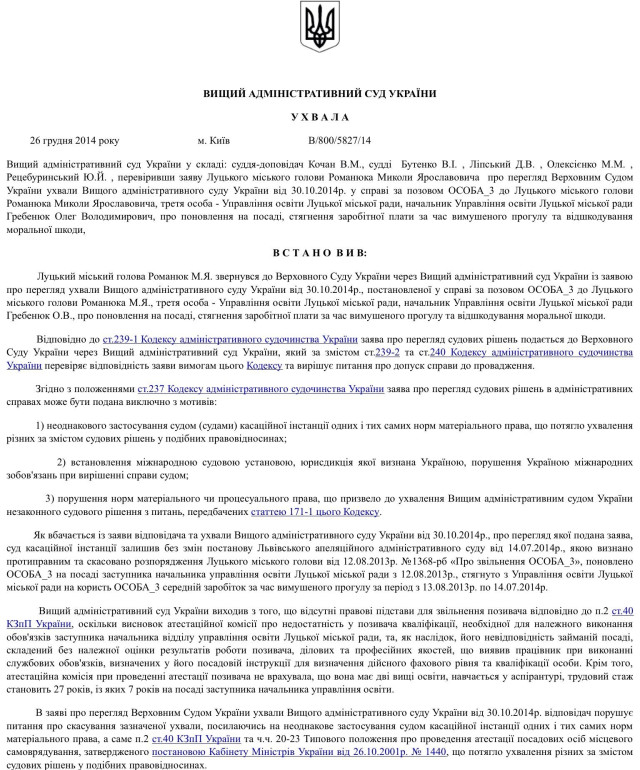 Вищий адміністративний суд України відмовив Луцькому міському голові Миколу Романюку в перегляді справи, що стосується остаточного поновлення Лілії Кревської на посаді заступника начальника управління освіти Луцької міської ради.