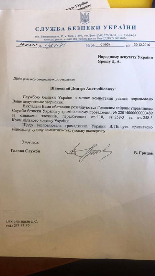 "Щодо висловлювань громадянина України В.Пінчука призначено відповідну семантико-текстуальну експертизу", – йдеться зокрема в документі.