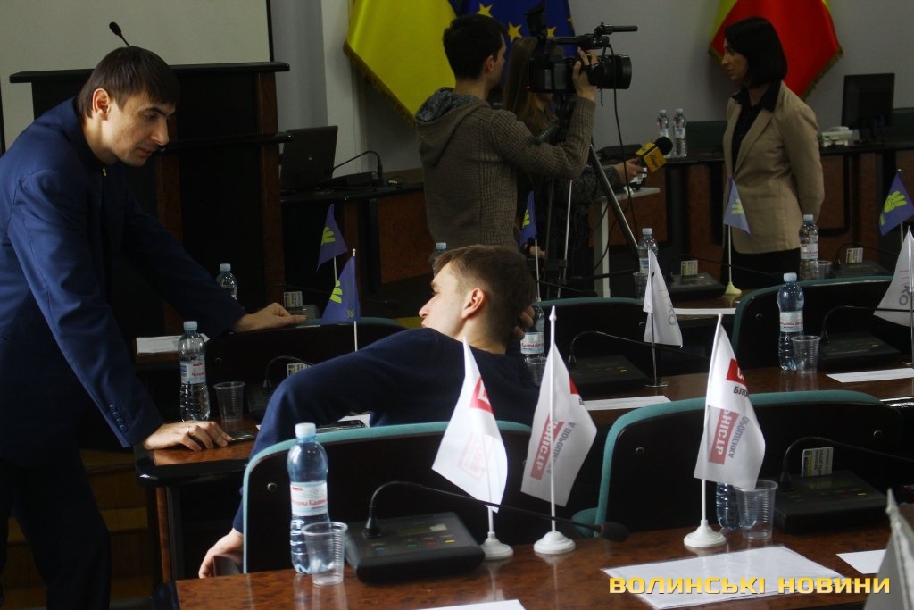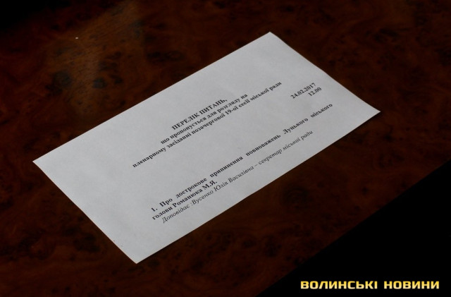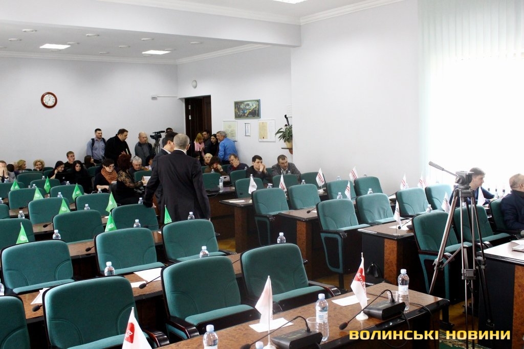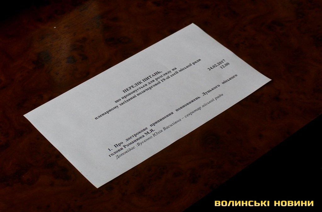 Станом на 12.40 в секретаріаті зареєструвалося 16 з 43 депутатів міської ради. В порядку денному сесії був лише один проект рішення – Про дострокове припинення повноважень Луцького міського голови Миколи Романюка.