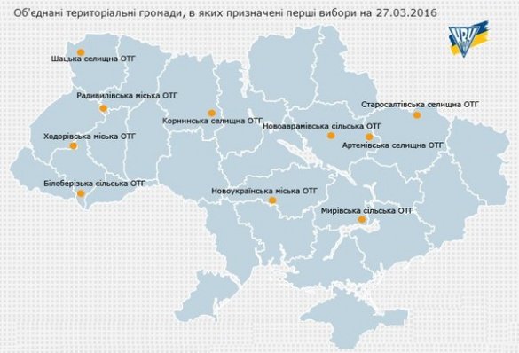 Додамо, що ЦВК призначила на 27 березня та 24 квітня 2016 року перші вибори депутатів місцевих рад та сільських, селищних, міських голів у 13 об’єднаних територіальних громадах різних регіонів.
