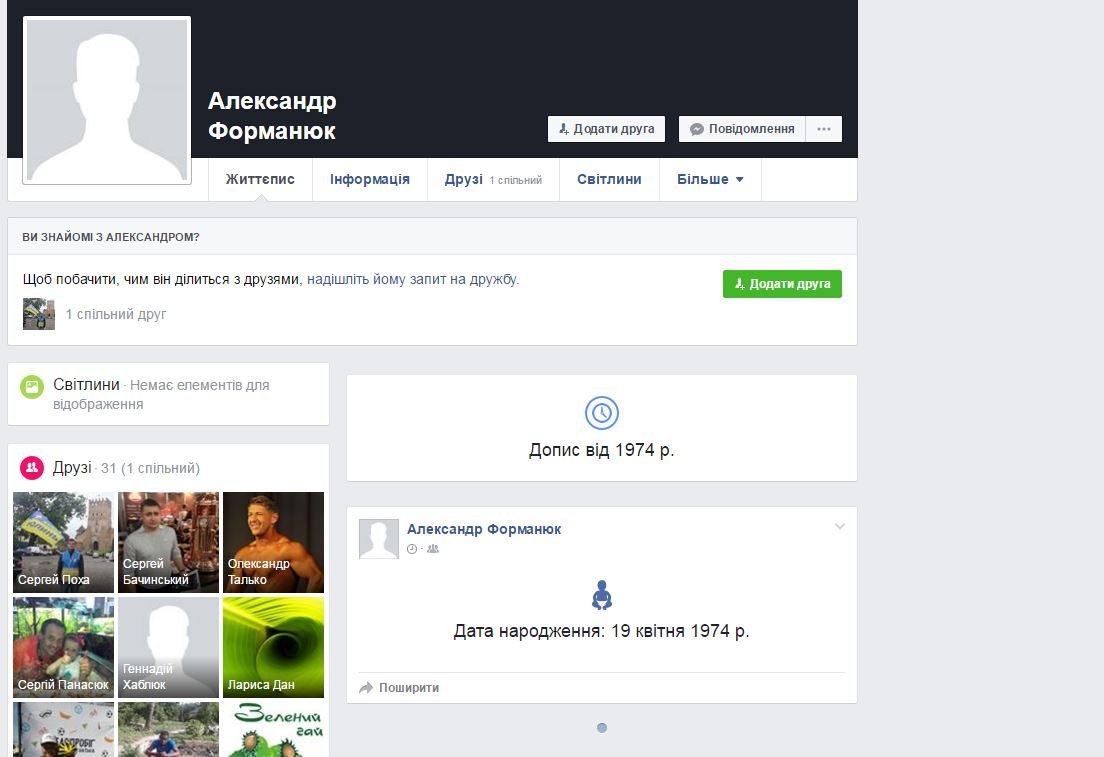 Єдина згадка про чоловіка у мережі – порожня сторінка в Фейсбуці. Зауважимо, що серед нечисельного переліку «друзів» Олександр Форманюка – активіст «Автомайдану Волині» Сергій Поха.