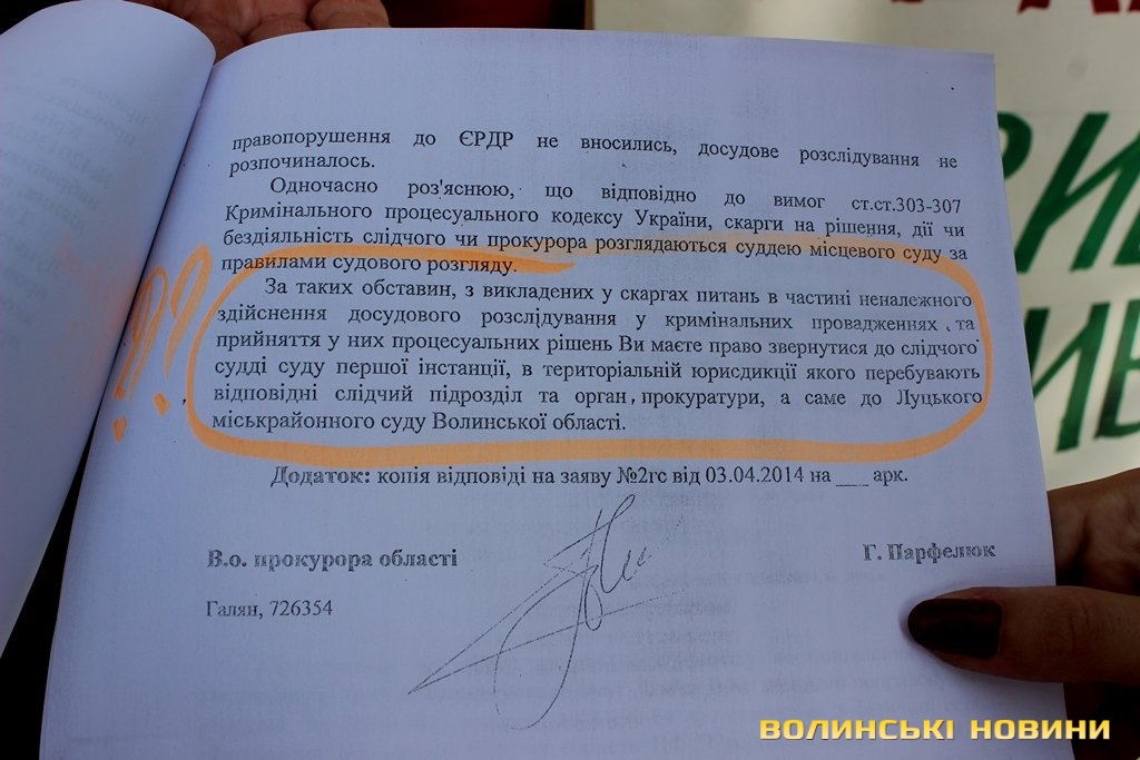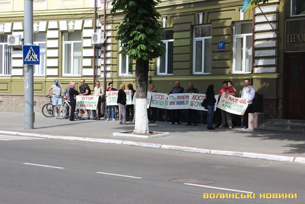 Менш як за два місяці – це вже третій пікет підприємців. Сьогоднішня акція зумовлена останньою відповіддю, яку вони отримали. Документ датований 14 травня і підписаний виконувачем обов’язків прокурора області Г. Парфелюком, дивуються лучани, адже нового прокурора області Анатолія Коцуру представили ще 4 квітня.