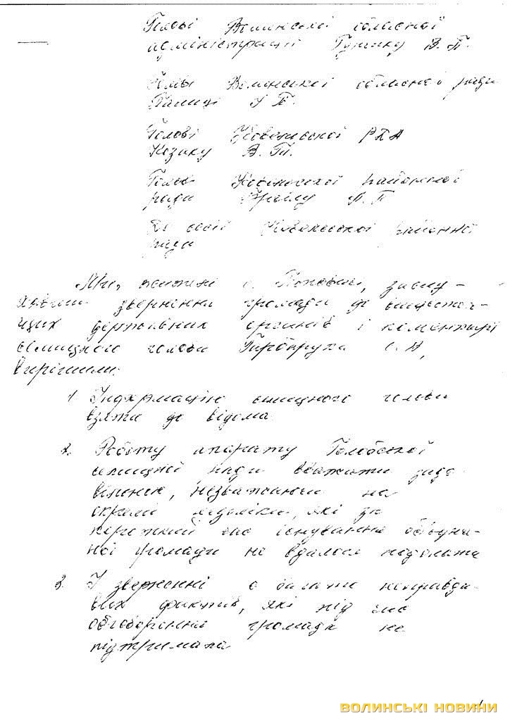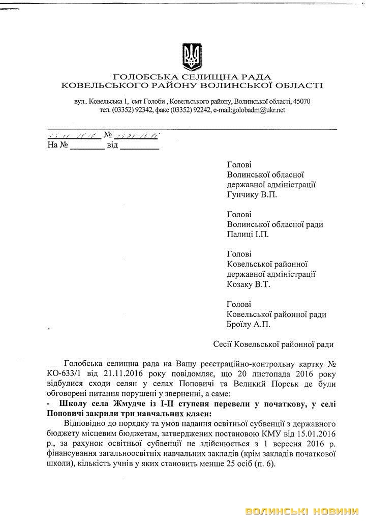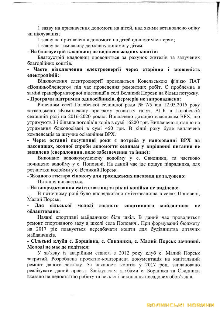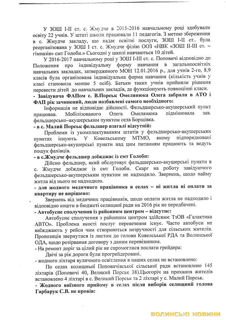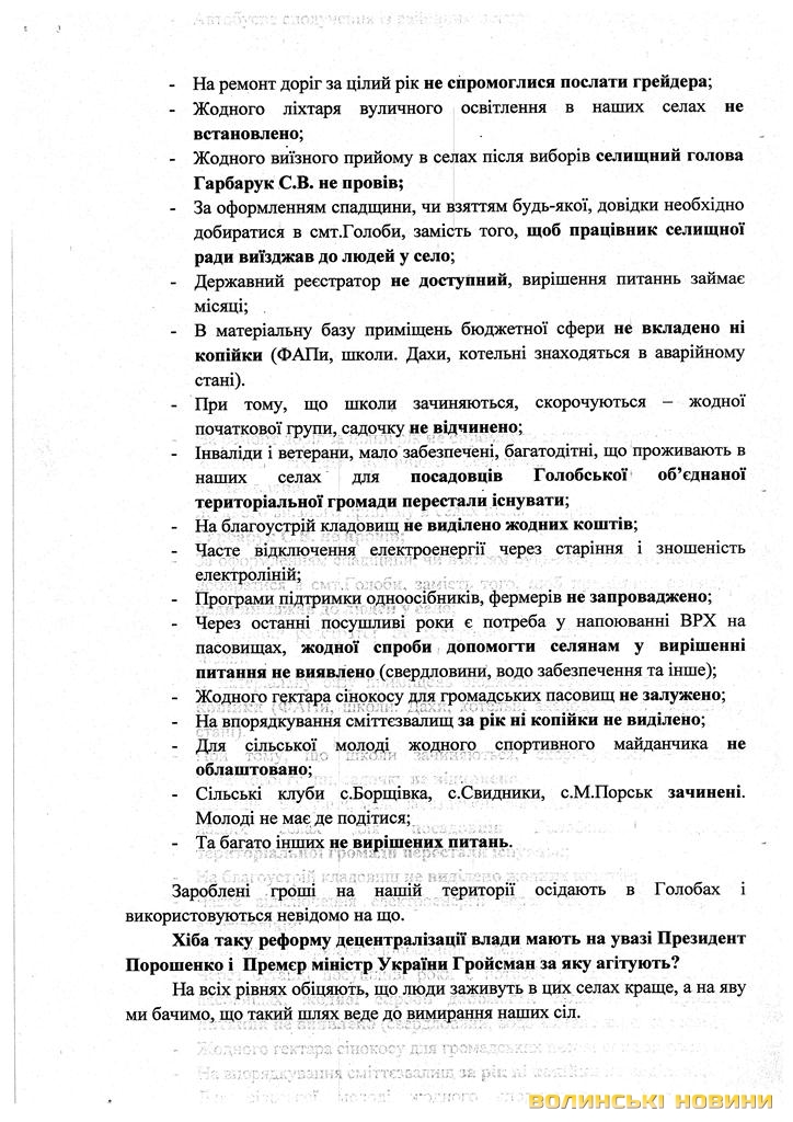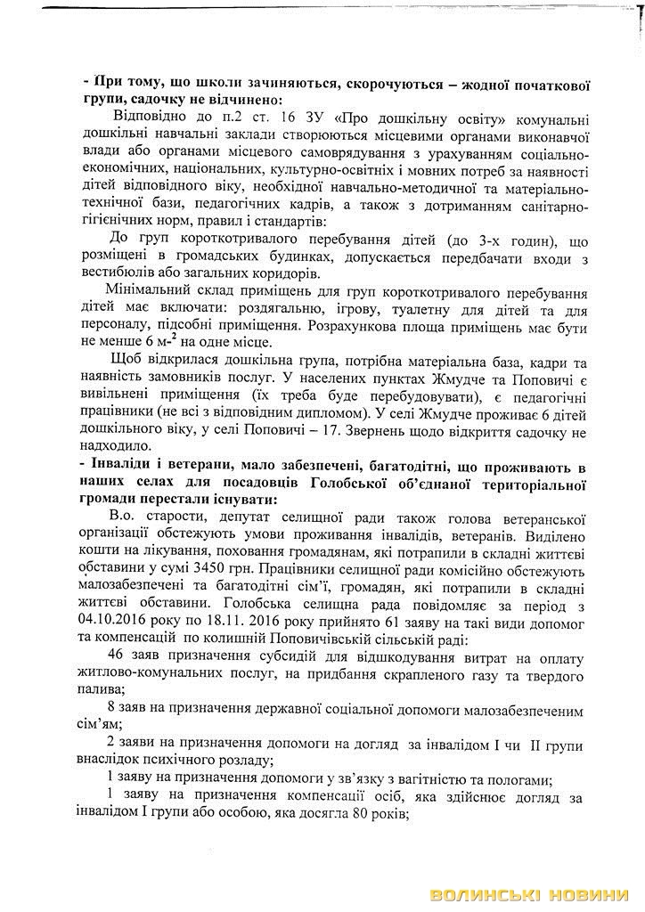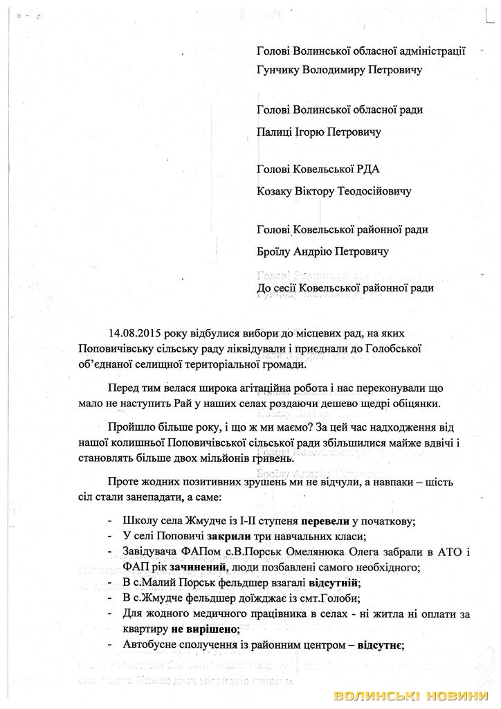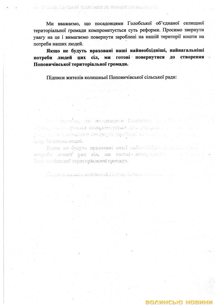 «Пройшло більше року після створення об’єднаної громади і що ж ми маємо? За цей час надходження від нашої колишньої Поповичівської сільської ради збільшилися майже вдвічі і становлять більше двох мільйонів гривень. Проте жодних позитивних зрушень ми не відчули, а навпаки - шість сіл стали занепадати. Зароблені гроші на нашій території осідають у Голобах і використовуються невідомо на що», - переконані автори листа.Цей документ дуже насторожив усіх адресатів. Тож, 20 листопада відбулися сходи селян за участю районних керівників і голови Голобської ОТГ.