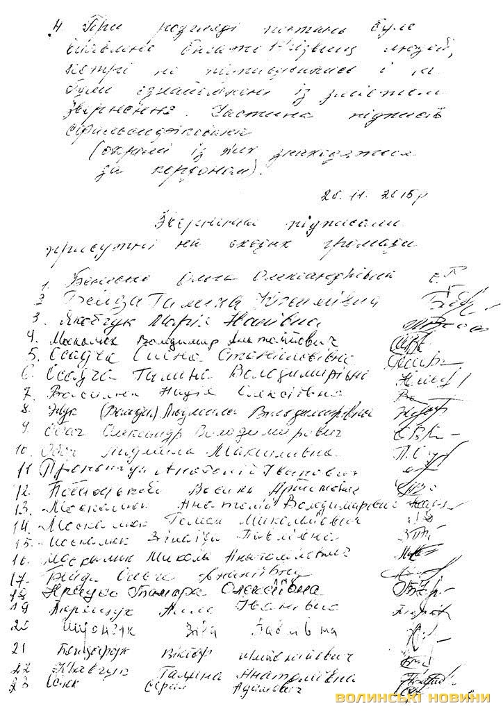 Під час сходу селян вівся й протокол. У протоколі зборів йдеться, що «у зверненні є багато неправдивих фактів, чимало підписантів не були ознайомлені з текстом звернення, підписи та прізвища були внесені без їх відома, дехто взагалі за кордоном».«Ми живемо у демократичній країні і кожна людина має конституційне право на звернення. Влада зобов’язана реагувати на звернення і робити все можливе для вирішення піднятих проблемних питань. За результатами розгляду даного звернення багато фактів, висвітлених у листі, не підтвердились. Виявилось, що люди підписувались не за такий текст звернення та багато підписів підроблені. Своїми діями організатори збору підписів створюють соціальну напругу серед жителів та дестабілізують ситуацію в об’єднаній громаді», - насамкінець зауважив селищний голова.