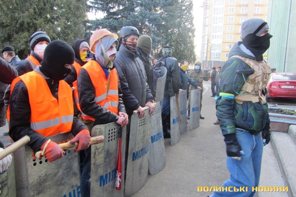 Перед будівлею райради зібралося більше півсотні представників «Правого сектора» Волині. Вони у шоломах, масках і зі спецзасобами. Перед будівлею активісти систематично б’ють дубинками у каски, тим самим створюють своєрідний шумовий тиск на посадовців.