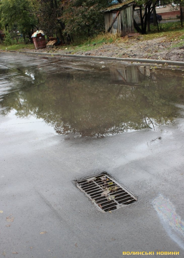 Після ремонту дорожнього покриття на одній із вулиць у центрі міста під час дощу утворюються великі калюжі, а решітка зливової каналізації розташована не за нормами.