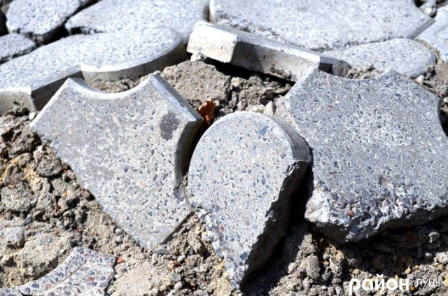 Частини бруківки розносяться майже по всій ширині тротуару.
