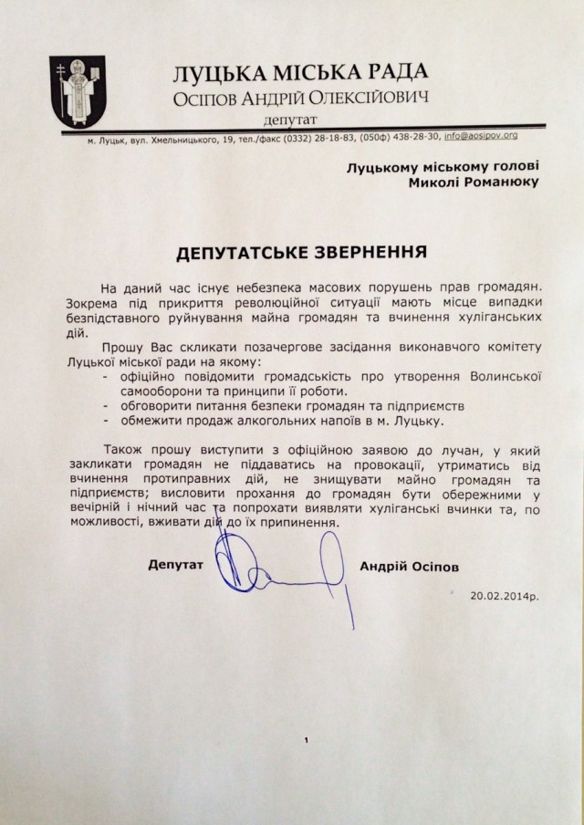 Зокрема у зверненні йдеться, з огляду на «революційні ситуації, де мають місце випадки безпідставного руйнування майна громадян та вчинення хуліганських дій, прошу Вас скликати позачергове засідання виконавчого комітету Луцької міської ради на якому: