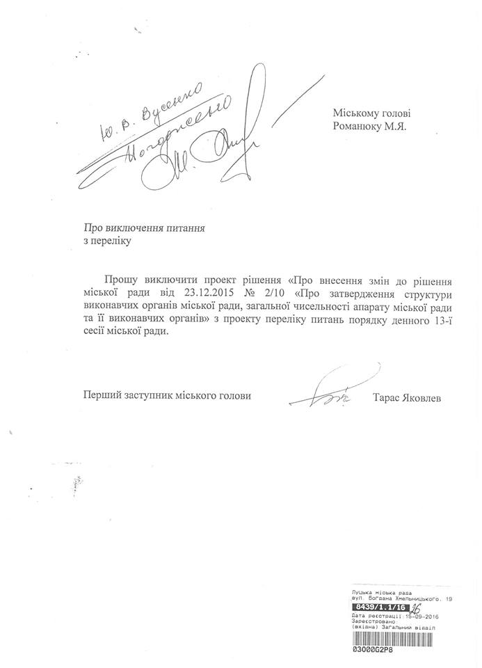 Так, 19 вересня на своїй сторінці у мережі Фейсбук депутат міськради Ігор Поліщук опублікував документ, у якому йдеться про те, щоб виключити проект рішення «Про внесення змін до рішення міської ради від 23.12.2015 № 2\10 «Про затвердження структури виконавчих органів міської ради, загальної чисельності апарату міської ради та її виконавчих органів» з проекту переліку питань порядку денного 13-ї сесії міської ради.«Цікавий поворот подій. На цій сесії мали знову протискати проект рішення про звільнення Леоніда Герасимюка та Ярослава Матвіїва, але, як бачимо, відмовились. Не назбирали голосів?», - йдеться у дописі Ігоря Поліщука.