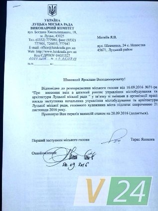 А сьогодні, 21 вересня, у ЗМІ стає відомо, що 16 вересня 2016 року Луцький міський голова видав розпорядження «Про внесення змін у штатний розпис управління містобудування та архітектури Луцької міської ради у зв’язку зі змінами в організації праці посада заступника начальника управління містобудування та архітектури Луцької міської ради, головного художника міста підлягає скороченню з 21 листопада 2016 року». Однак на момент розміщення цієї публікації на сайті міської ради цього розпорядження не було. Як пояснили у коментарі Інформаційному агентству Волинські новини у відділі кадрів міськради, «це не така вже й важлива новина, щоб публікувати її на сайті». Але, водночас, пообіцяли розглянути пропозицію журналіста все таки документ «вивісити» на сайті.