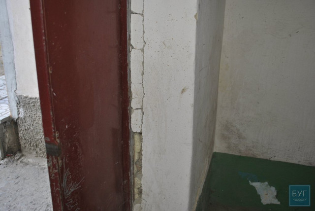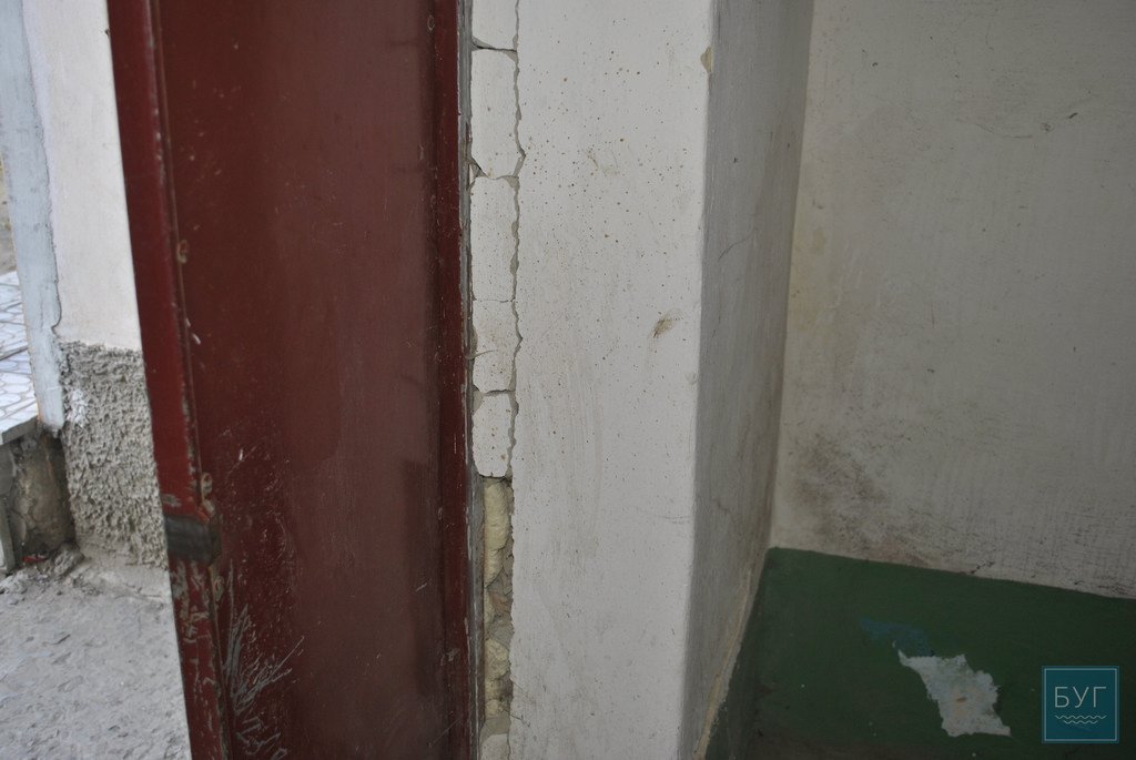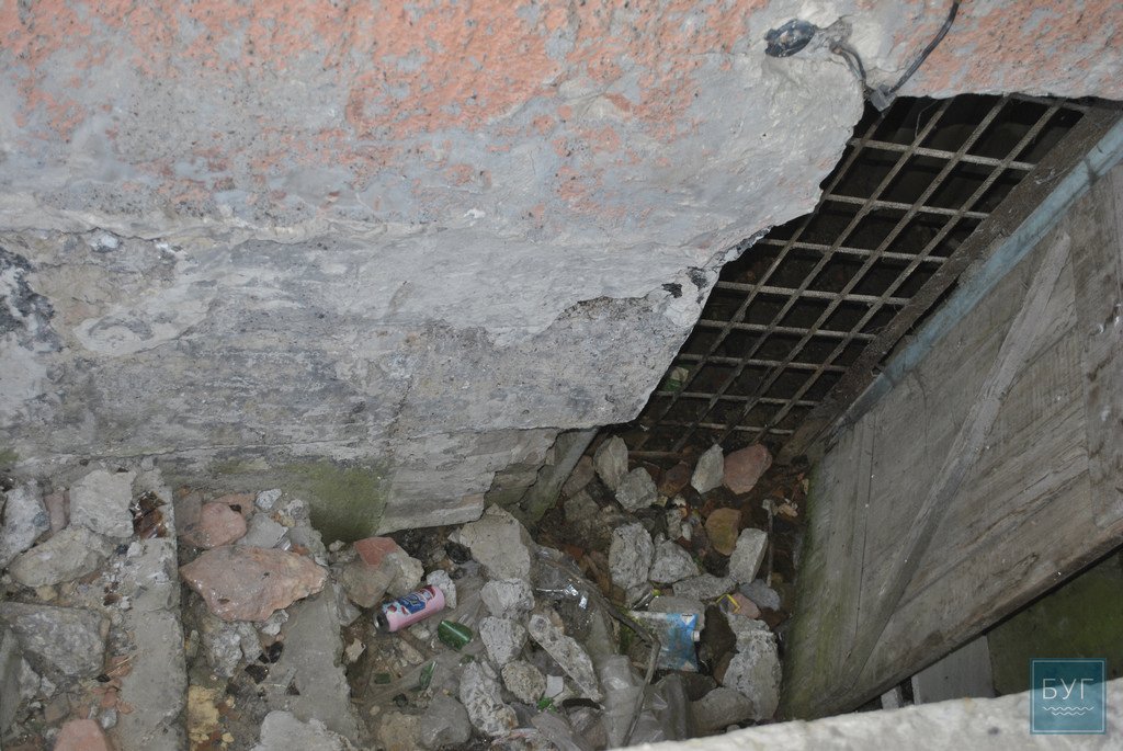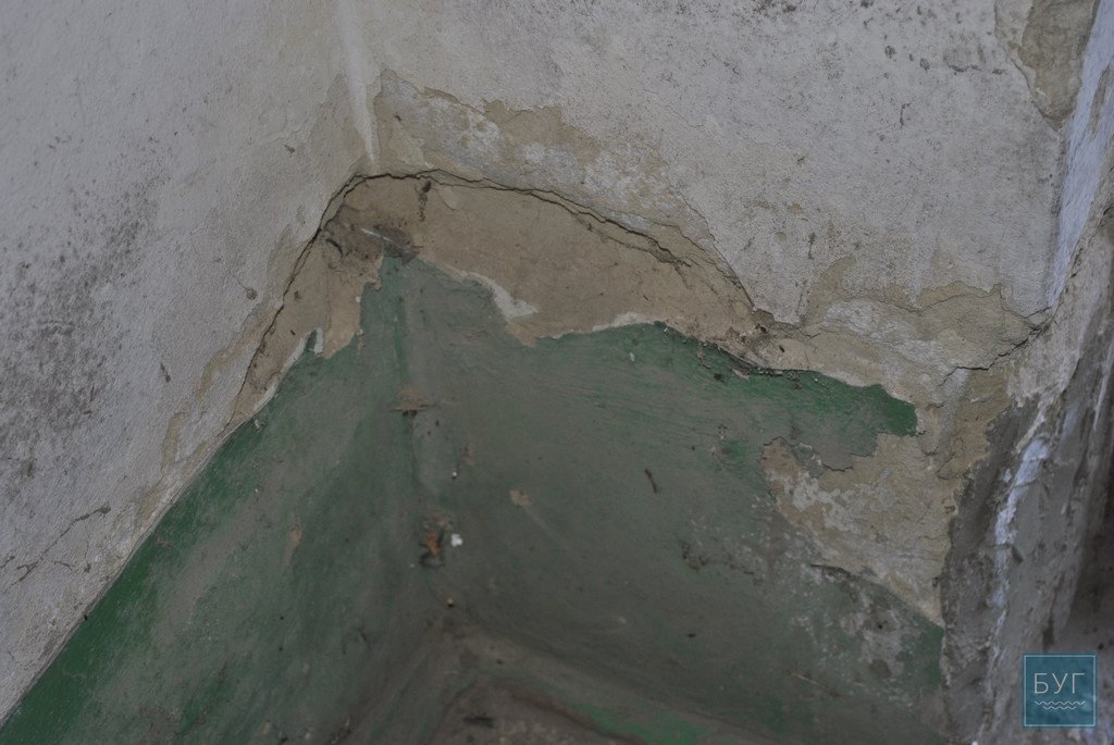 Люди розповідають, що 2 роки тому в багатоповерхівці робили збори, після яких працівники жеку вичистили всі люки, вивезли два здоровенні причепи сміття. Ззовні видно “залатане” місце біля балкону – там була тріщина. В під’їзді зняли трубу і тепер тут від грибку руйнується стіна.
