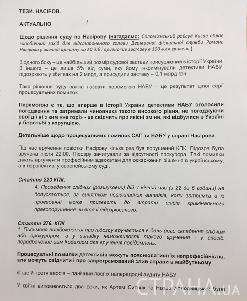 Автори таємних вказівок позитивно оцінюють притягнення прокурорами НАБУ Насірова до кримінальної відповідальності. Водночас вони створюють образ безпосередніх учасників затримання головного податківця як "лузерів" та профанів.Автори "темників" просувають думку, що рішення суду у справі Насірова є повною поразкою НАБУ, використовуючи низку аргументів.Одним з них є те, що сума застави, яку було обрано для Насірова, в двадцять разів менша за ту, яку антикорупційний орган вимагав від судді. Також провладним спікерам потрібно робити наголос на низку процесуальних помилок під час затримання Насірова.