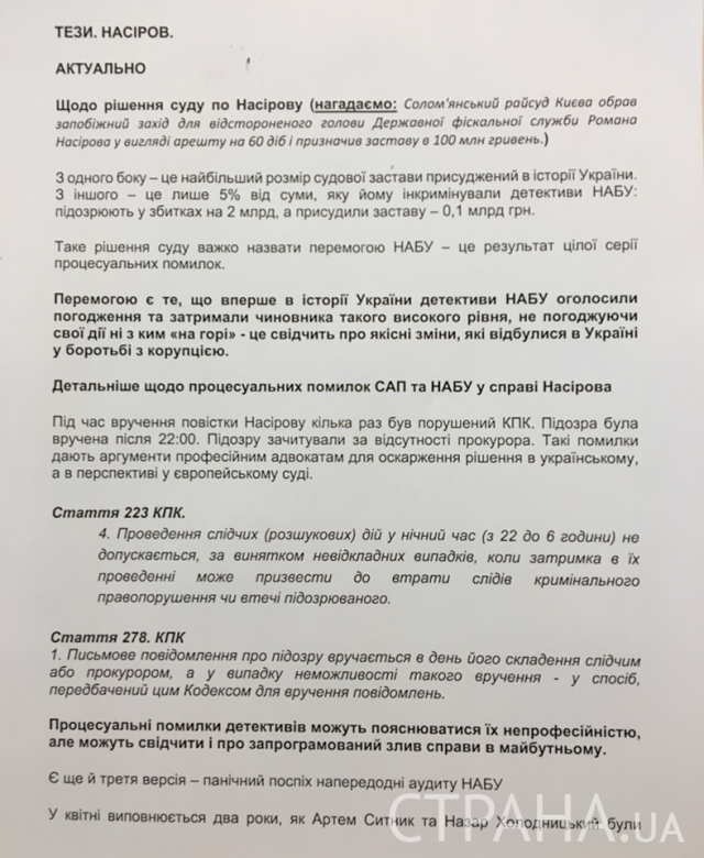 Технологи Адміністрації президента підготували "темники" щодо арешту відстороненого глави Державної фіскальної служби Романа Насірова, у яких розміщені рекомендації про те, як можна дискредитувати роботу антикорупційних органів.