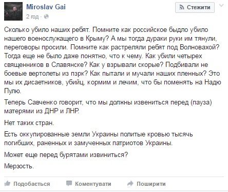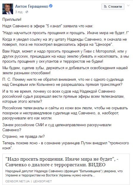 Савченко сказала у кого просити вибачення- це раз. А два - нехай Геращенко і подібні до нього хоч місяць побудуть на першій лініі фронту а тоді пишуть свої " гнівні" коментарі.