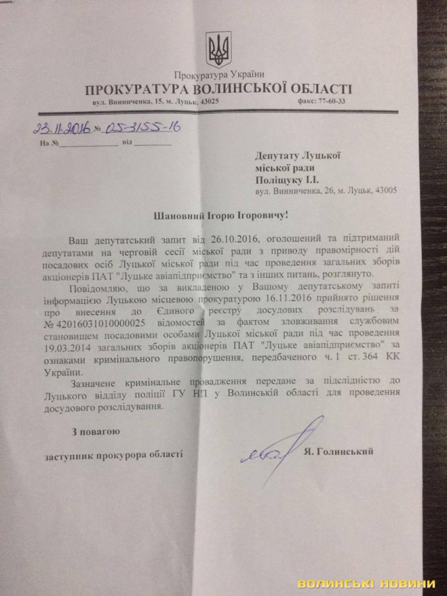 Слід зазначити, що в прокуратурі все ж зреагували на запит Поліщука - 16 листопада там розпочали кримінальне провадження за фактом зловживання службовим становищем посадовими особами міськради під час проведення загальних зборів акціонерів.