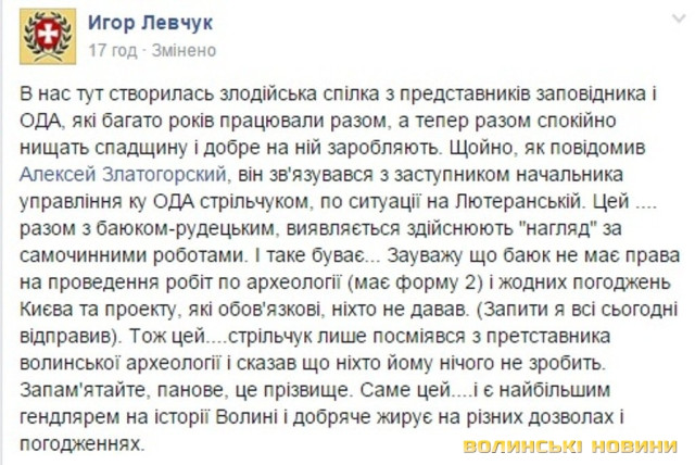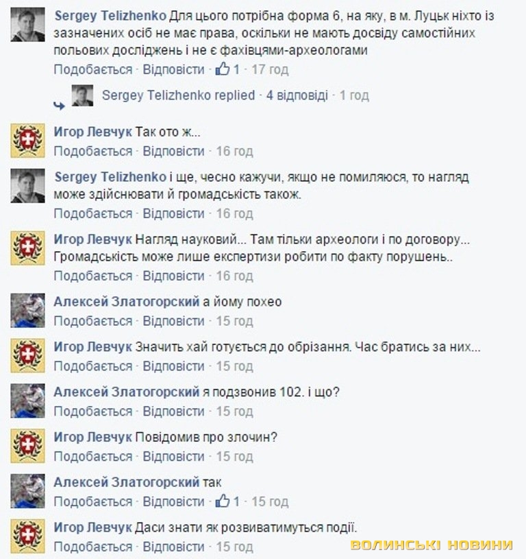 Так, член експертної групи при міськраді Ігор Левчук в мережі Фейсбук повідомив, що вже надіслав запити щодо проведення робіт у Міністерство культури, з яким і мали б погоджуватися, з його слів, роботи в заповіднику. В переписці з ним директор ДП «Волинські старожитності» Олексій Златогорський зазначив, що він зателефонував на номер 102 і повідомив про злочин.Однак у черговій частині міськвідділу на усний запит кореспондента Інформаційного агентства Волинські Новини відповіли, що вчора ввечері таких повідомлень не надходило.