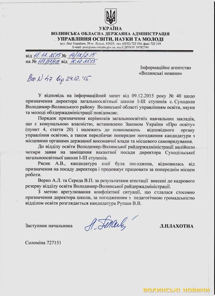 Зрештою, після відповідей на інформаційні запити, стало відомо, що на посаду директора Суходольської школи з’явилася четверта кандидатура – Віктор Рупша. На сторінці відділу освіти Володимир-Волинської РДА інформаційної системи управління освіти йдеться, що Віктор Рупша був уповноваженою особою відділу і куратором району по загальноосвітніх та дошкільних навчальних закладах.