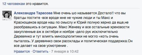 Глава управління у справах ветеранів і воїнів АТО у Мінсоцполітики досить активно обговорювала у соцмережах всі заяви бійців про неналежний рівень обслуговування у "Женеві". В одному зі свої коментарів вона ледь не прямим текстом звинуватила у цьому скандалі голову Держслужби у справах ветеранів.