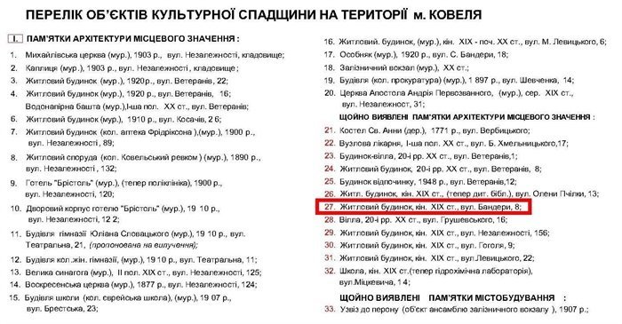 І ще, Людмила Мурай ніби розповіла, що «під час огляду території міста Ковеля розробниками історико-архітектурного плану було виявлено об’єкт на вулиці Степана Бандери, 8, який вони запропонували внести до пам’яток архітектури». Відповідно до Порядку обліку об’єктів культурної спадщини, рішення про занесення виявлених таких об’єктів приймається Міністерством культури України. Зі слів Людмили Любомирівни, «якщо об’єкт внесуть до пам’яток архітектури місцевого значення, то його власнику буде направлено письмове повідомлення про набуття правового статусу щойно виявленого об’єкту культурної спадщини». Зрештою, оце і все – так зване «спростування» так званої «недостовірної інформації».