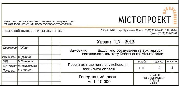 Генеральний план розробив Державний інститут проектування міст «Містопроект» (м. Львів), замовником містобудівної документації є відділ містобудування та архітектури виконавчого комітету Ковельської міської ради. Відповідальні за організацію розгляду пропозицій були екс-секретар міськради Михайло Гетьман та головний архітектор міста Людмила Мурай.