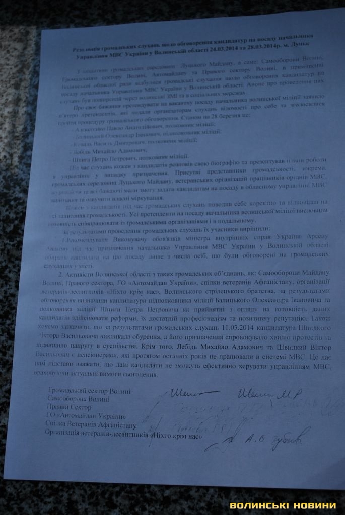 Активісти додають, що на посаду керівника обласної міліції є ряд інших кандидатур, які не викликають питань у представників громадськості. До офіційного звернення долучили резолюцію громадських слухань щодо обговорення кандидатур на посаду начальника УМВС України у Волинській області. У ній представники громадськості рекомендували Арсену Авакову призначити на цю посаду одного з кандидатів, які заявили про своє бажання претендувати на неї, та пройшли процедуру громадських слухань.У звернені до Олександр Турчинова та Арсенія Яценюка активісти наполегливо просять втрутитись у ситуацію «і припинити свідоме чи несвідоме розгойдування ситуації в області, що має місце з боку міністра Авакова та патронованого ним Віктора Швидкого».
