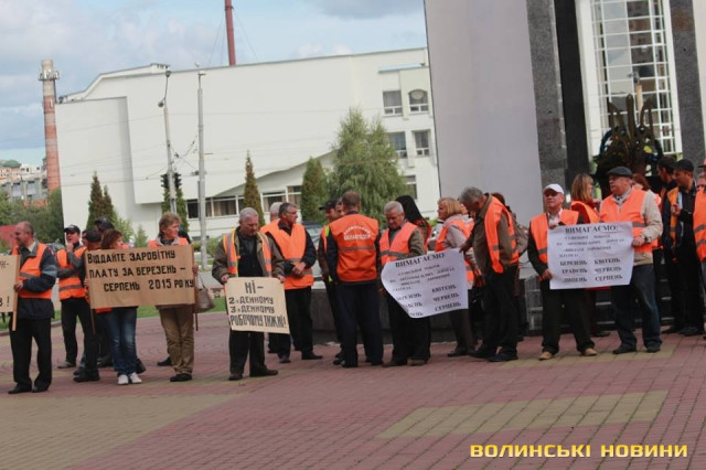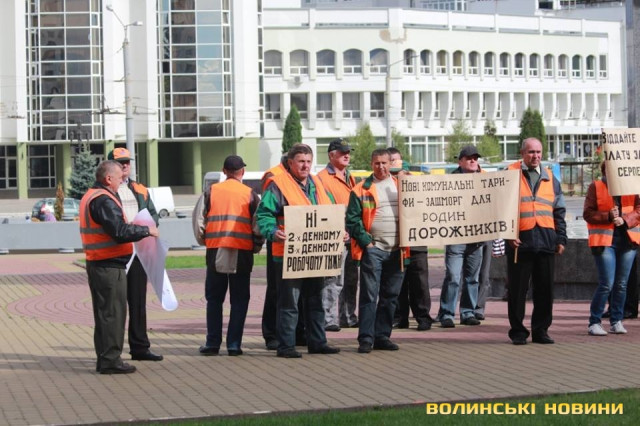 Наразі їх збирається під будівлею все більше. В руках вони тримають транспаранти з написами - «Віддайте зарплату за березень-серпень 2015», «Ні дводенному і триденному робочому тижню», «Нові комунальні тарифи – зашморг для родин дорожників».