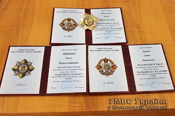 Відповідно до наказу МВС України нагрудний знак «За безпеку народу» отримав оперуповноважений відділу боротьби з незаконним обігом наркотиків УМВС України у Волинській області підполковник міліції Олег Матчук. Старший слідчий слідчого управління УМВС України у Волинській області капітан міліції Іван Дацьо та заступник начальника слідчого відділення Луцького РВ майор міліції Іван Філонюк нагороджені нагрудними знаками «За відзнаку в службі».