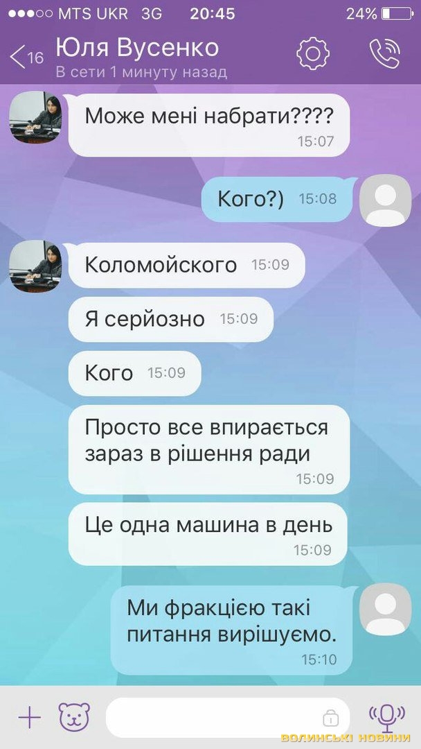 У доказ цьому депутат Поліщук продемонстрував фрагмент переписки з Юлією Вусенко в месенджері Viber.У відповідь Вусенко почала переконувати, що це був лише жарт.