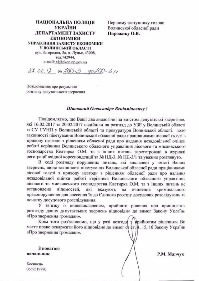 Першого заступника голови Волинської обласної ради Олександра Пирожика обурила відповідь волинських поліцейських на його депутатське звернення щодо правомірності використання шкільних автобусів для довезення лісівників на акцію протесту під стіни обласної ради 8 лютого.