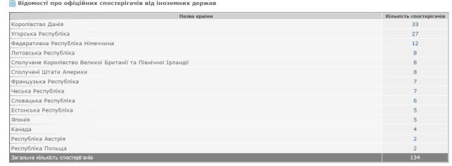 Згідно з офіційною інформацією ЦВК, в Україні були спостерігачі із 14 країн: Королівство Данія, Угорська Республіка, Федеративна Республіка Німеччина, Литовська Республіка, Сполучене Королівство Великої Британії та Північної Ірландії, Сполучені Штати Америки, Французька Республіка, Чеська Республіка, Словацька Республіка, Естонська Республіка, Японія, Канада, Республіка Австрія, Республіка Польща.