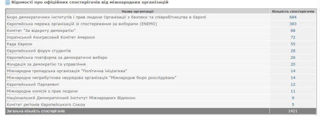 Загальна кількість зареєстрованих спостерігачів – 134.Також стежили за перебігом виборів й представники 14 міжнародних організацій, таких як: Бюро демократичних інститутів і прав людини, Організації з безпеки та співробітництва в Європі, Європейська мережа організацій зі спостереження за виборами (ENEMO), Комітет «За відкриту демократію», Український Конгресовий Комітет Америки, Рада Європи, Європейський форум студентів, Європейська платформа за демократичні вибори, Фундація за демократію та управління, Міжнародна громадська організація «Політична ініціатива», Міжнародна неприбуткова неурядова організація «Міжнародне бюро розслідувань», Європейський Парламент, Міжнародна комісія з прав людини, Національний Демократичний Інститут Міжнародних Відносин, Комітет регіонів Європейського Союзу.