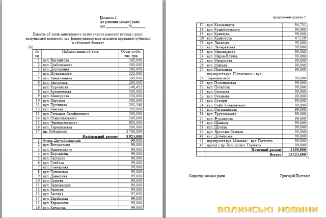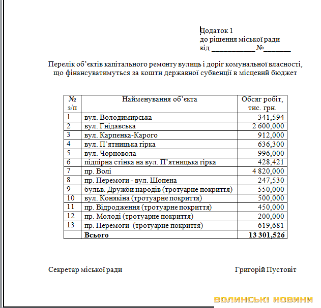 Попередній перелік для ознайомлення уже опублікований на офіційному сайті Луцької міської ради. Зокрема, на капітальний ремонт вулиць і доріг комунальної власності, що фінансуватимуться за кошти державної субвенції в місцевий бюджет планують витратити 13,301 мільйона гривень.