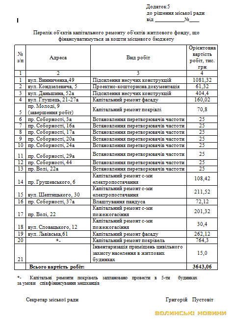 На капітальний ремонт об’єктів житлового фонду з місцевого бюджету виділили 3,643 мільйона гривень. Окрім того, в проекті рішення передбачили й прибудинкові території, на які чекає капітальний ремонт цього року.