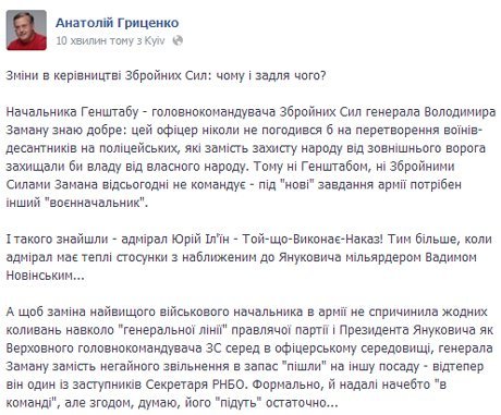 "Тому ні Генштабом, ні Збройними Силами Замана відсьогодні не командує - під "нові" завдання армії потрібен інший "воєнначальник". І такого знайшли - адмірал Юрій Іл'їн - Той-що-Виконає-Наказ!", - зазначив Гриценко.