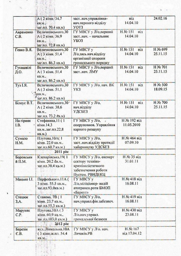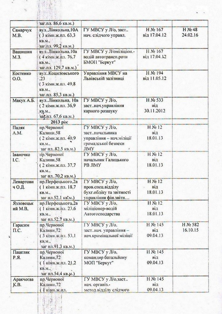 44 працівники Прокуратури Львівської області отримали службове житло – 34 з них в подальшому вилучили його з числа службових, тобто приватизували. (додаток 1)