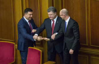 На помпезну подію - презентацію книжки «Четвертая республика», співавтором якої є глава Адміністрації Президента Борис Ложкін, - прийшли вершки політикуму. Завітав навіть президент Петро Порошенко, прем’єр-міністр Арсеній Яценюк та голова Верховної Ради України Володимир Гройсман. Утрьох вони і сфотографувалися, вочевидь, намагаючись продемонструвати присутнім, що в країні – порядок і коаліція єдина, як ніколи...
