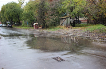 Після ремонту дорожнього покриття на одній з вулиць у центрі міста під час дощу утворюються великі калюжі, а решітка зливової каналізації розташована не за нормами