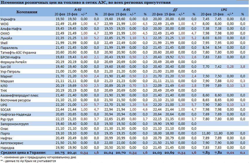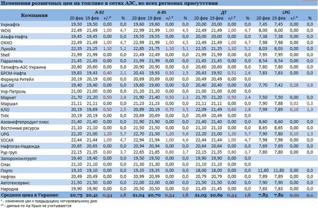 Сьогодні, 20 лютого, середньозважена вартість А-92 і "п’ятірки" підскочила на 34 коп. — до 20,75 грн/л і 21,04 грн/л відповідно.