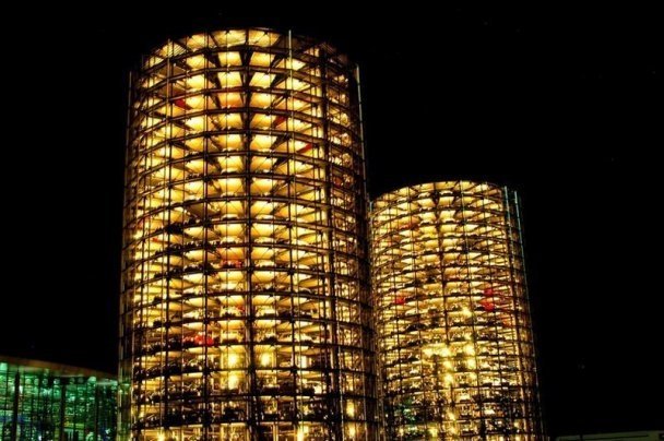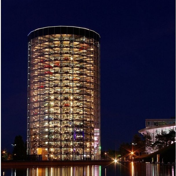 Але одним із головних об’єктів «Автоштадту» є дві 60-метрові автомобільні вежі ‒ своєрідні багаторівневі парковки. Кожна споруда вміщає 400 машин. Самі вежі з’єднані з заводом Volkswagen 700-метровим підземним тунелем, через який автоматична конвеєрна система доставляє автомобілі із заводу в підвал веж. Звідти їх також автоматично піднімають до потрібного рівня механічні «роботи».