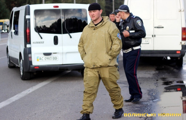 «Ми тут вже четвертий день стоїмо і потім з іншими поміняємося. Ми, разом з даішниками, перевіряємо буси, чи не везуть вони контрабанду. Поки тут стоїмо, то жодного порушення не зафіксували, усе спокійно. Будемо ще тут стояти доти, доки не настане порядок в країні», - розповідає Станіслав, який представився айдарівцем.У нього було й посвідчення, в якому зазначалося, що чоловік - учасник громадського формування «Самооборона Волині». В документі вказано, що він має право брати участь у забезпеченні охорони громадського порядку, вживати, спільно з працівниками міліції, заходів до припинення адміністративних правопорушень і злочинів.