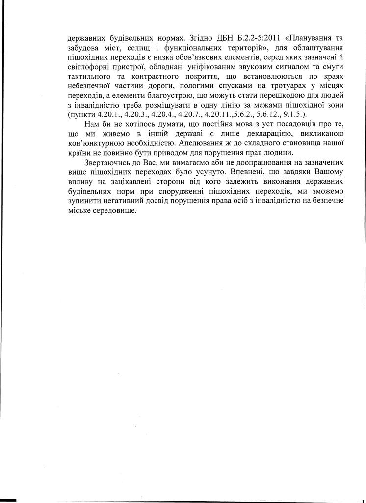 Звертаючись до Вас, ми вимагаємо аби не доопрацювання на зазначених вище світлофорах було усунуто. Впевнені, що завдяки Вашому впливу на зацікавлені сторони від кого залежить виконання державних будівельних норм при спорудженні пішохідних переходів, ми зможемо зупинити негативний досвід порушення права осіб з інвалідністю на безпечне міське середовище.